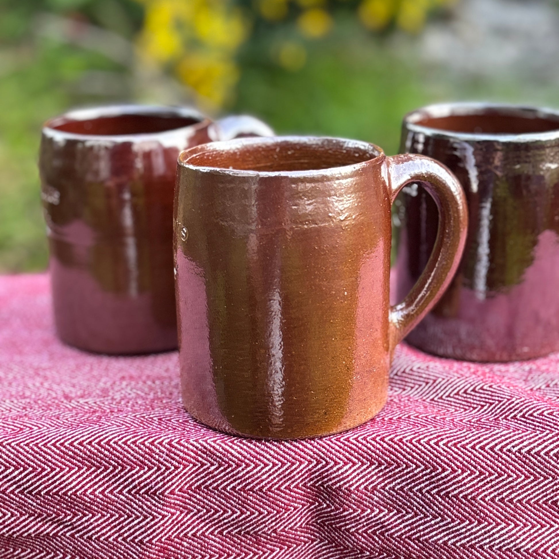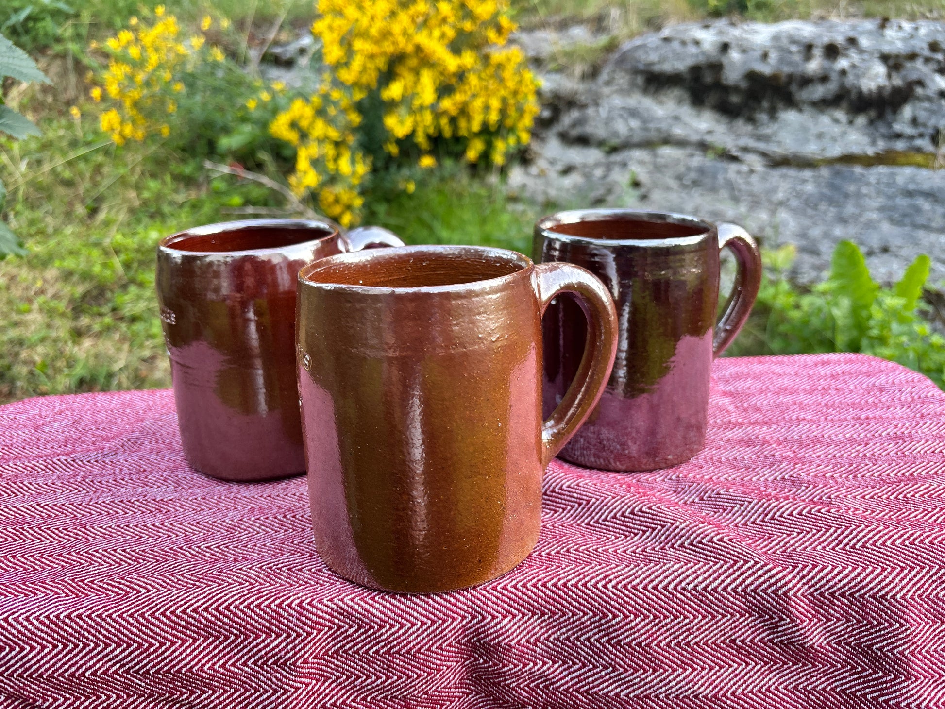 Tre kjempefine og velholdte gamle krus i brun keramikk fra svenske Höganäs.
