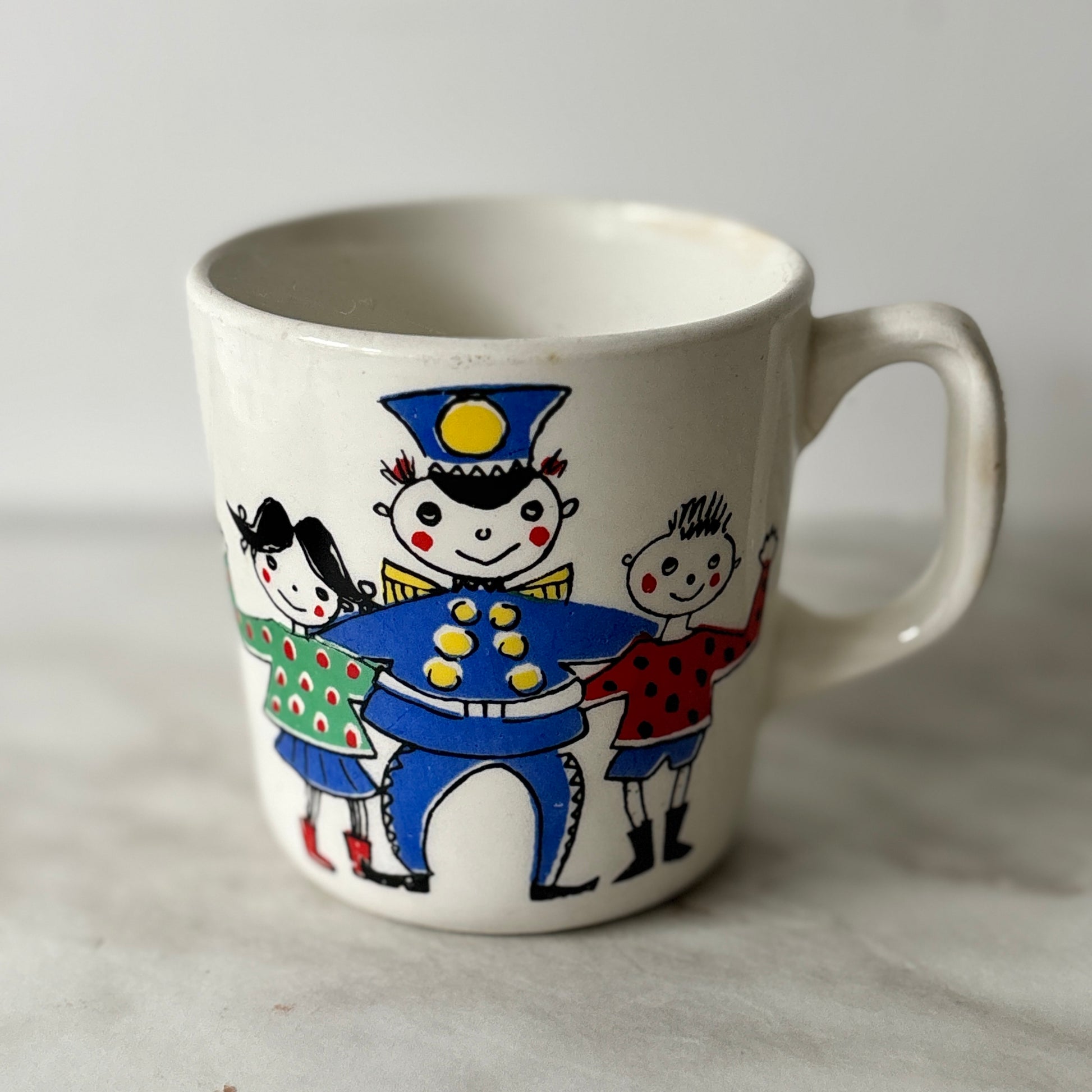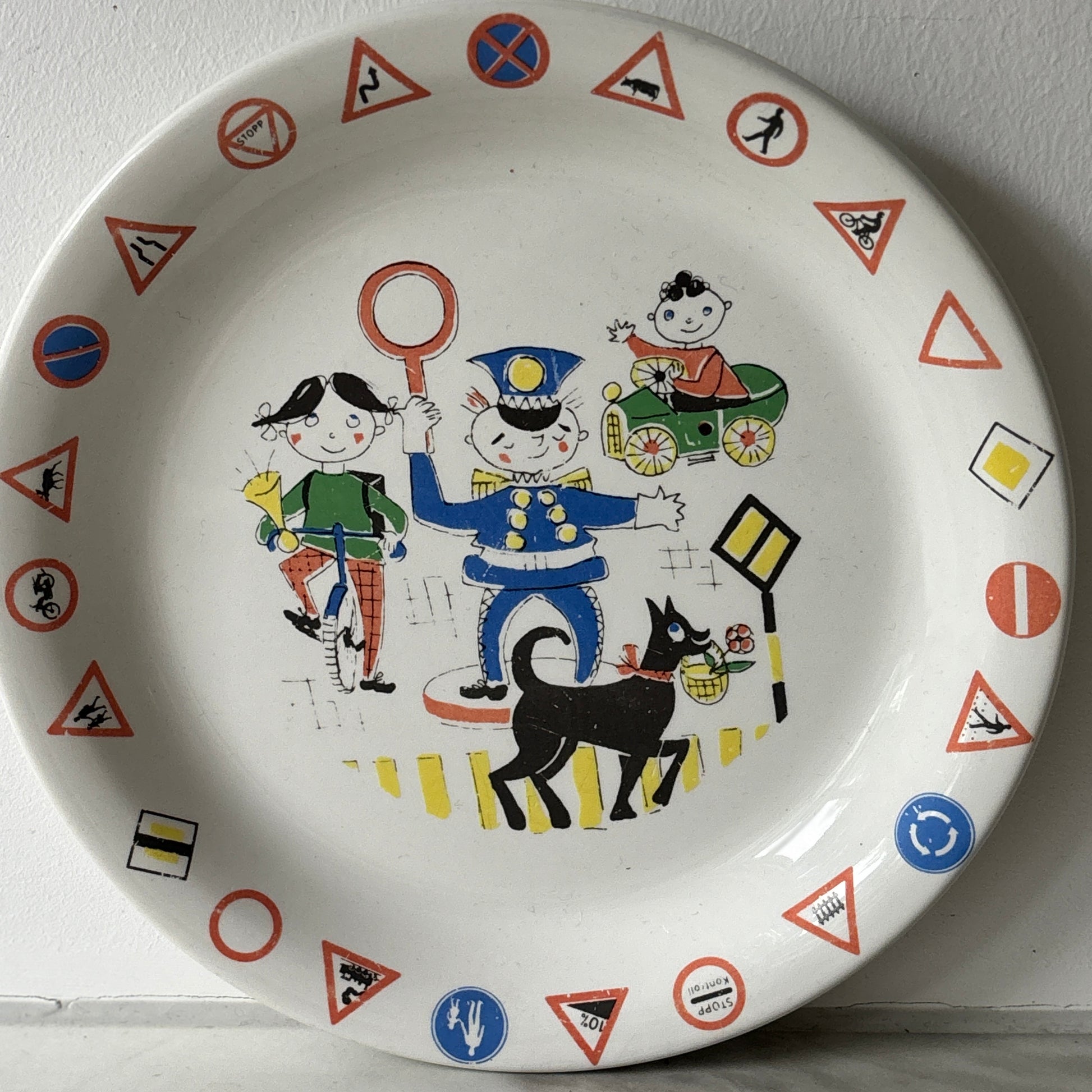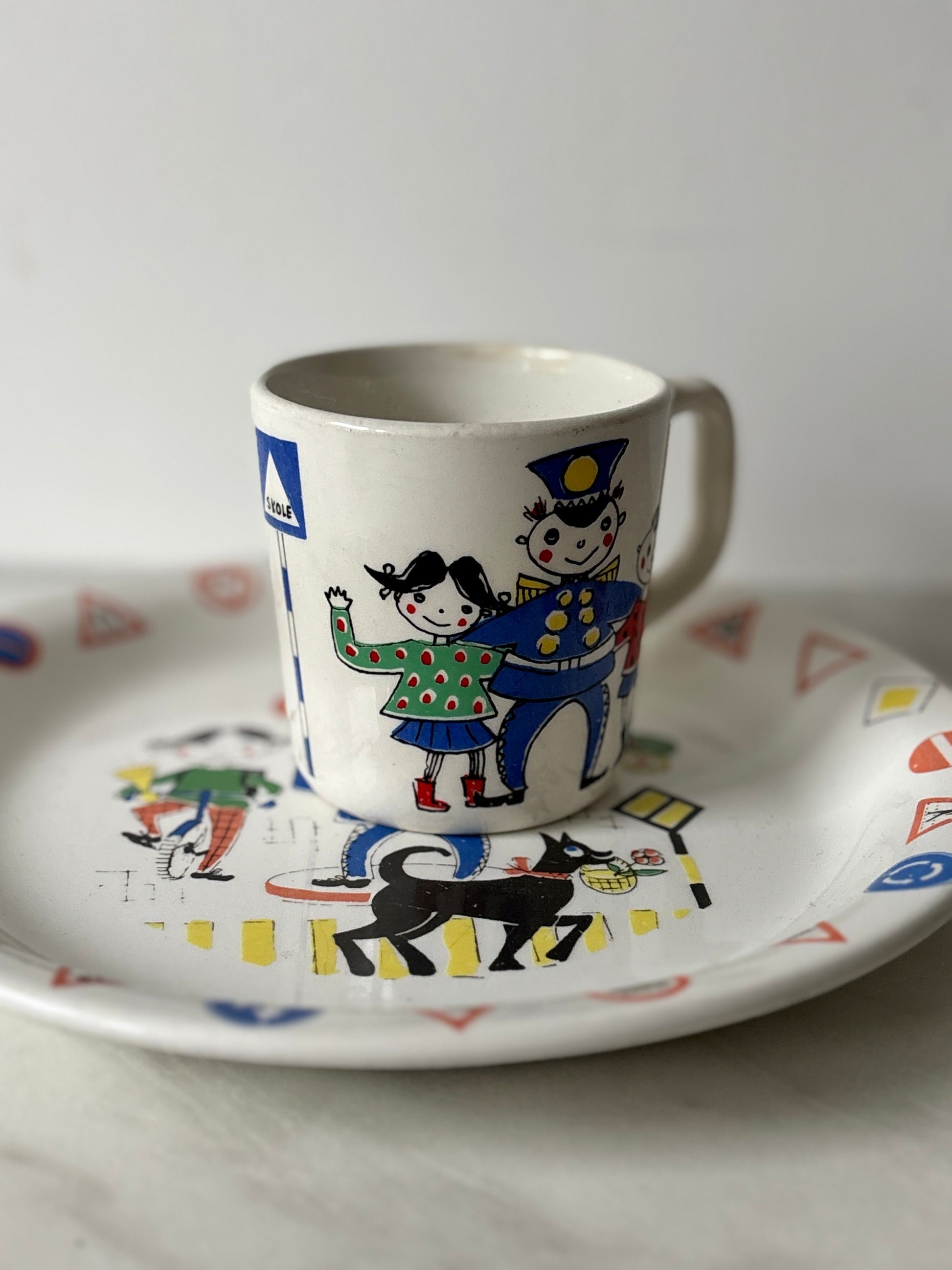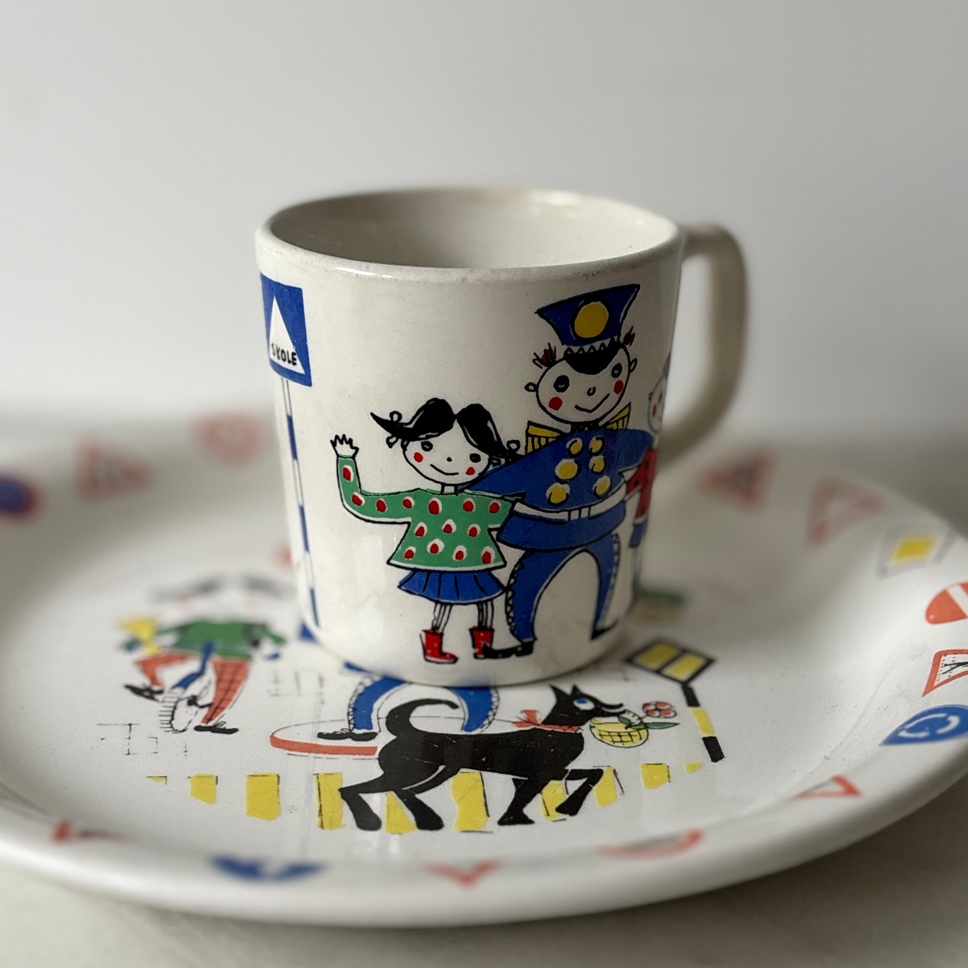 Koselig vintage sett med kopp og tallerken fra Stavangerflint. Merket «Trygg trafikk» . Det følger med en dyp tallerken også, men det hadde endel krakelering og sendes med på kjøpet.