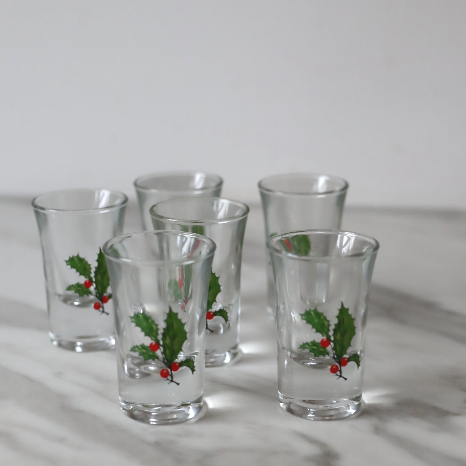 Seks drammeglass med julemotiv. Selges samlet. Disse er ubrukt. Høyde 7 cm.
