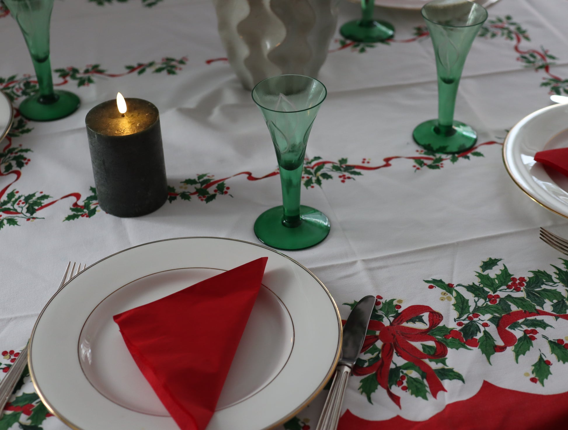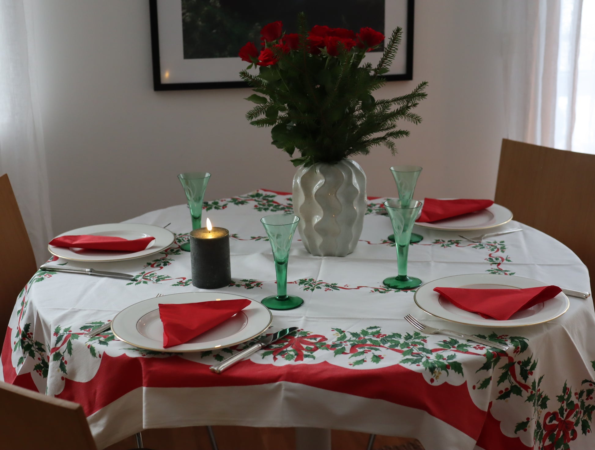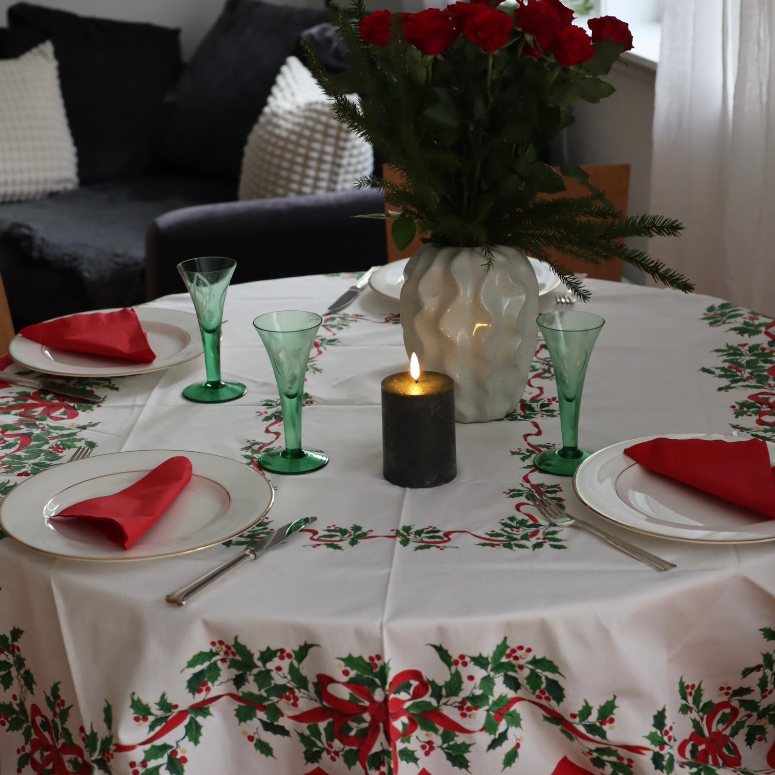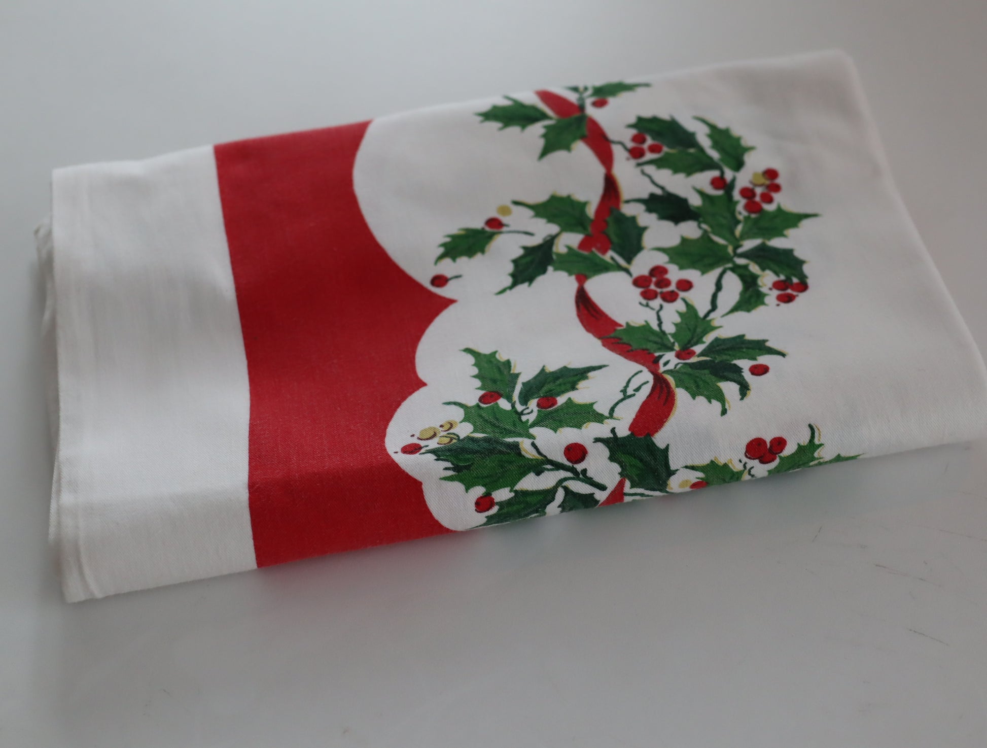 Koselig gammeldags juleduk i bomull. Fint trykt mønster med kristorn og røde sløyfer. Tipper at denne er fra 60-70-tallet. Fin hvis du skal dekke et julebord i gammeldags tradisjonell norsk julestil.