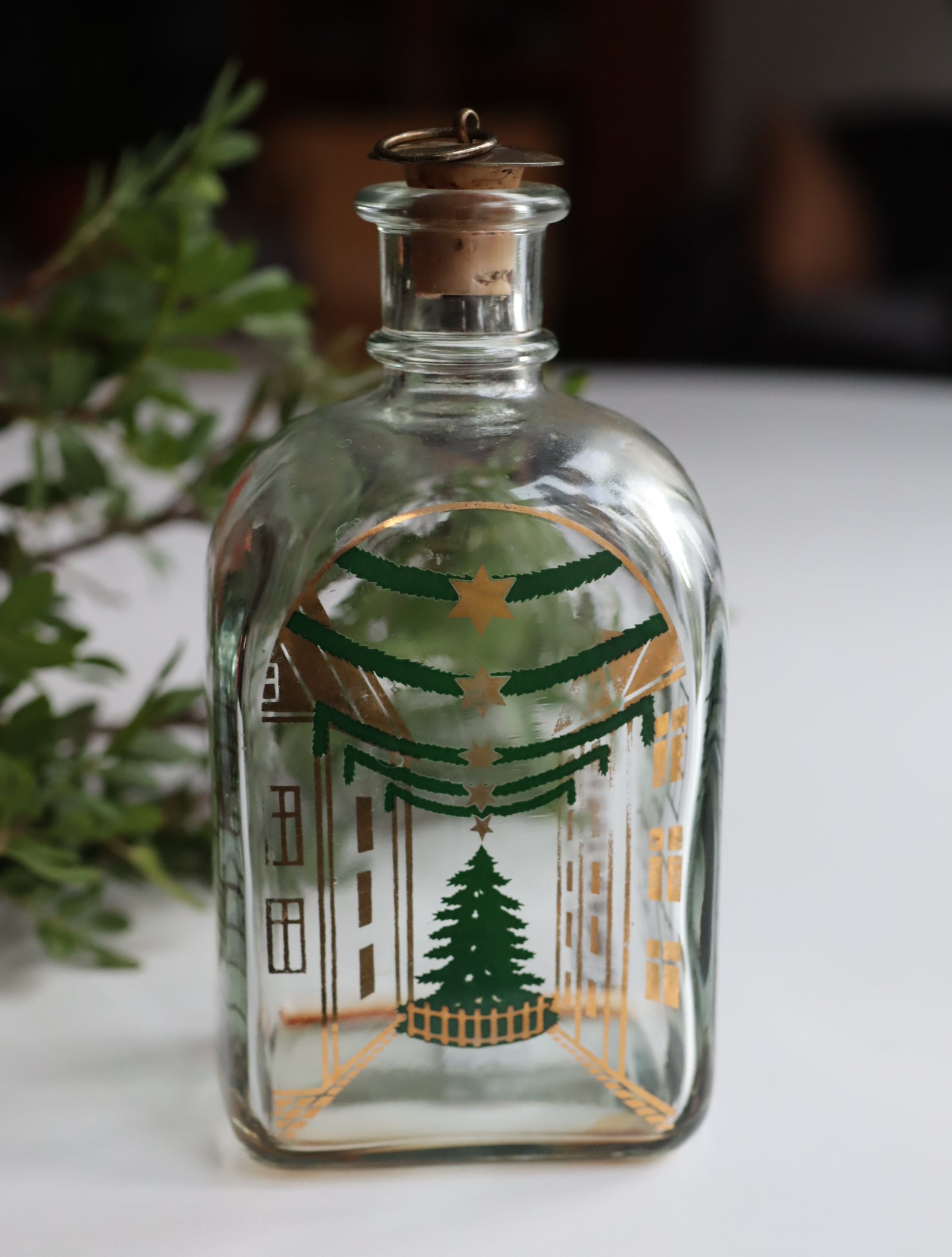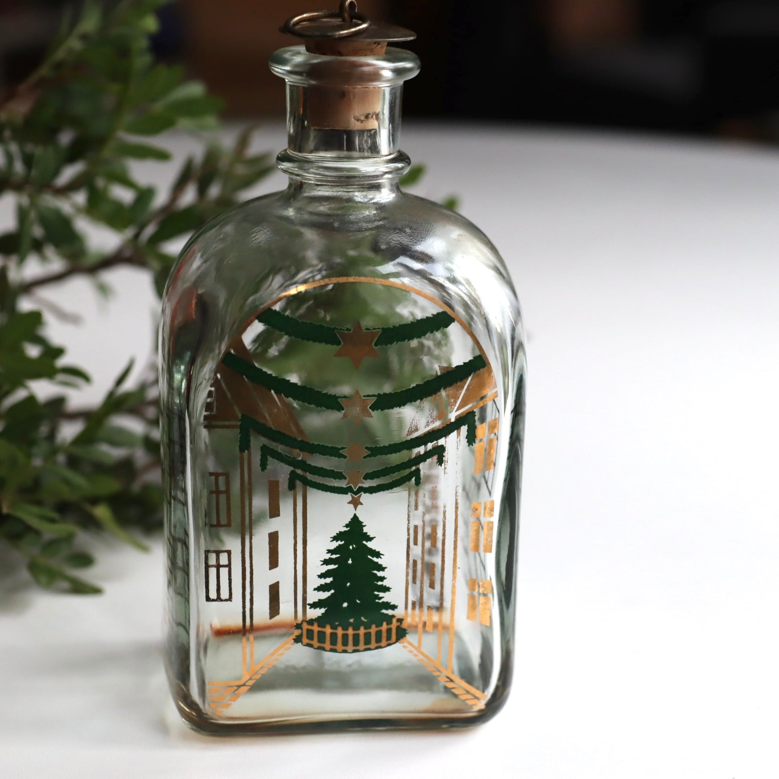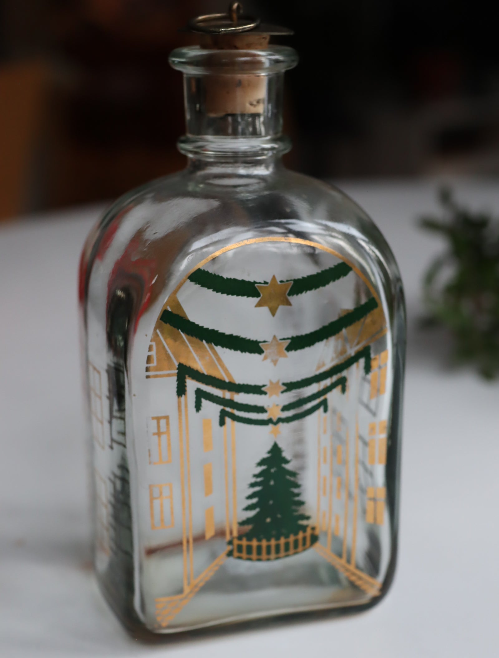 Snapsflaske fra Holmegaaard. Motiv med juletre, hus og vinduer i grønt og gull.
